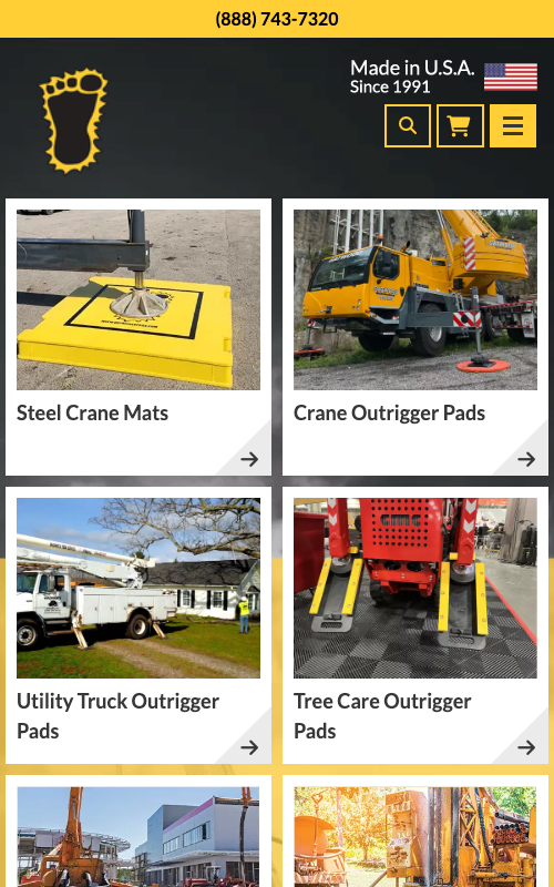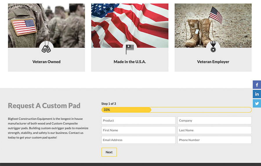 Consistency and consolidation are two key features of the Bigfoot website. Adhering to a consistent design throughout the website creates a unified online presence; no matter where a user lands on the site, they know it’s Bigfoot Outrigger Pads. Consolidating each product on their homepage highlights all the available options, and links to each specific product page provide all the details a potential customer needs to know.