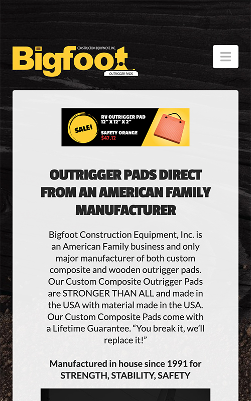 In December 2022, Green Closet Creative launched a newly designed and developed website for our client Bigfoot, a manufacturer of outrigger pads. The client had been working with a legacy firm for many years, and we were asked to provide a fresh set of eyes. Bigfoot leveraged our GCC marketing team that comprises 25 years of experience in manufacturing, Mike Blaser, and 20+ years experience in marketing, Darby Dwyer.