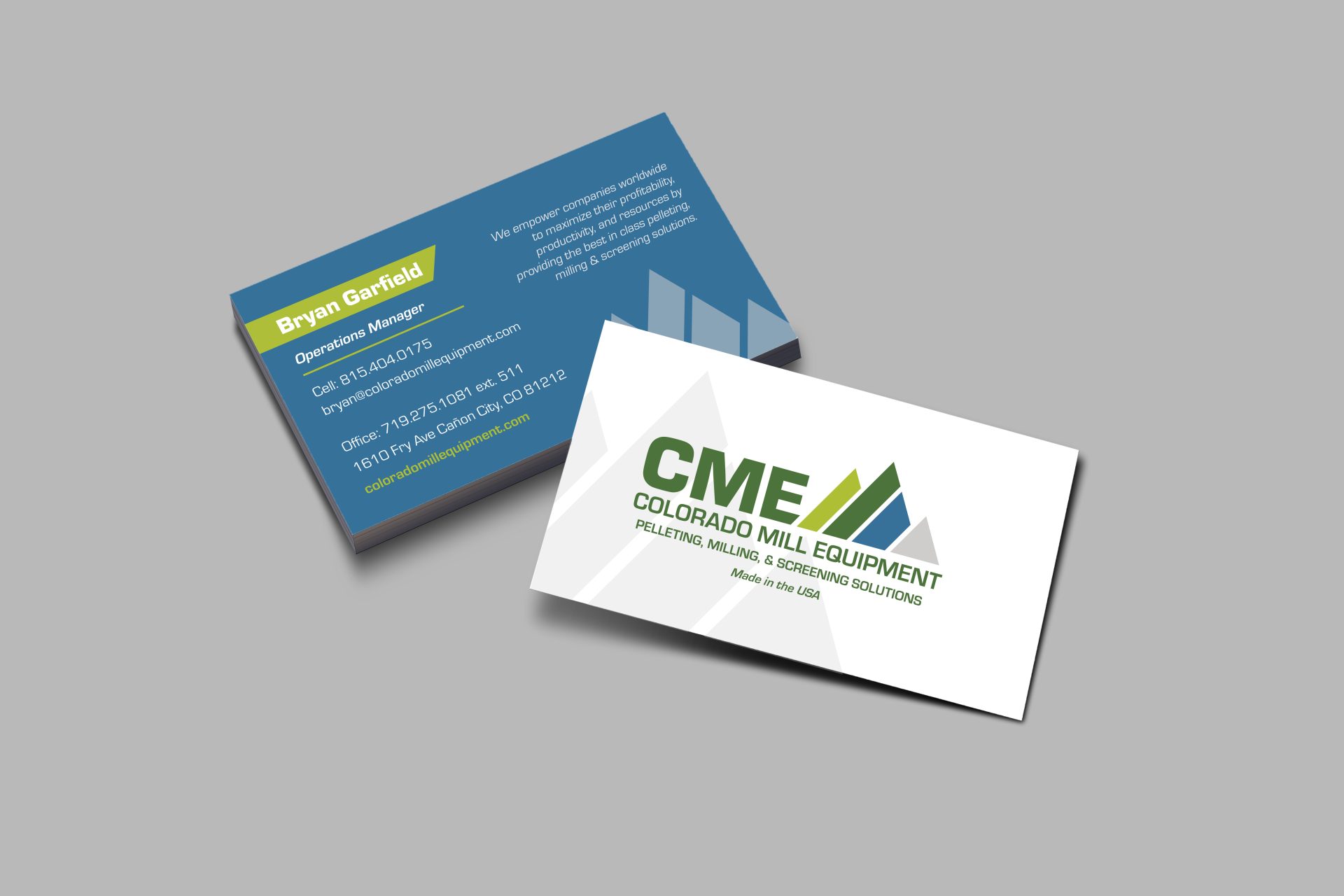 The CME business cards also needed updating. We chose to utilize blue as a primary color with adding accents of green,and we brought in the mountain for other graphic elements. To play off the industrial feel of the brand and the mountain element, we included a graphic line to highlight each employee’s title. We used an angled element to add contrast and hierarchy to the CME name, similar to the feel of the mountain graphic.