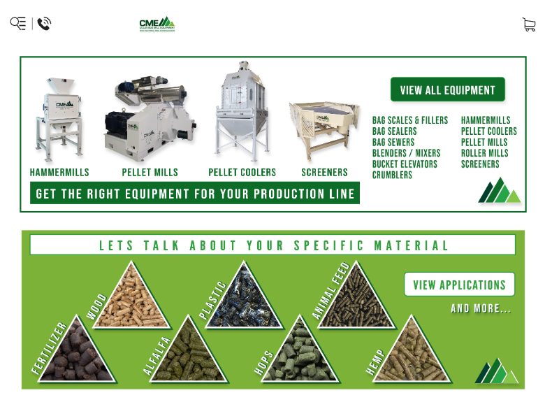 To better represent their company, CME wanted their site to be more approachable and emphasize that all of their products are assembled in the US and that they are committed to sustainability. Additionally, because their former site did not provide many avenues for customers to find the machines for which they were looking, another goal of ours was to streamline the search process and provide customers with suggestions for other machines that could benefit them.