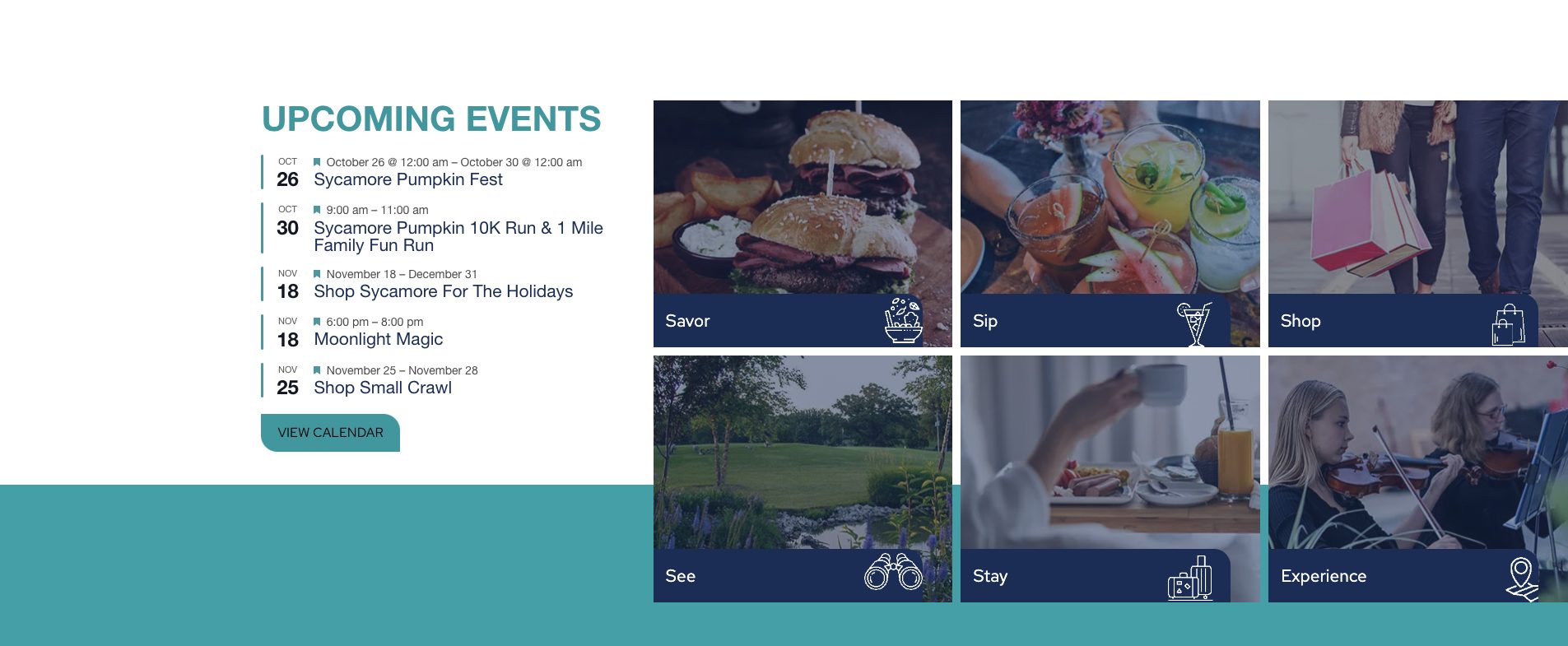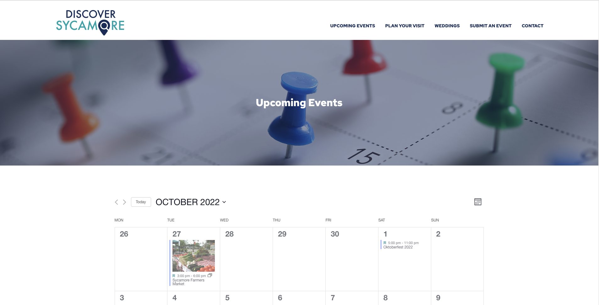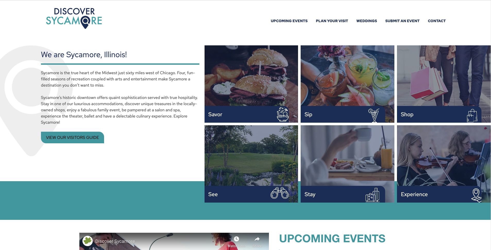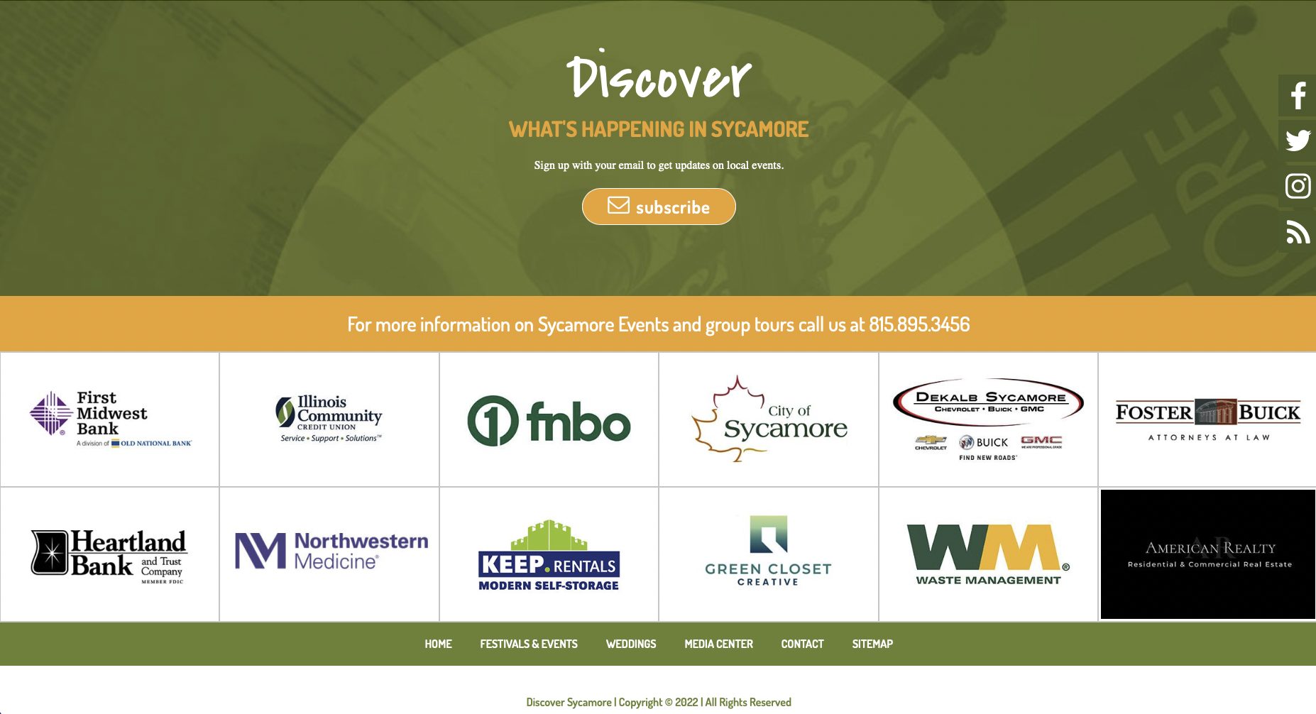 Sycamore is an active little town with plenty of events and activities throughout the year. An important part of the website is to make those events known so the community and visitors are always involved. We created a full, easy to read calendar page, allowing visitors to quickly see what’s going on in Sycamore. We then added a marketing space on the website where our client could quickly add current and upcoming events so visitors can see what’s right around the corner.