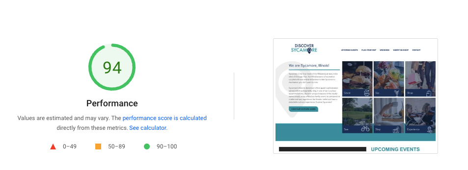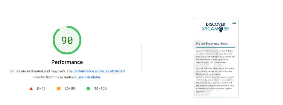 Today, speed is everything when it comes to websites. We all have to admit, when a site takes too long to load, we lose patience. Not only that, to grow in any industry today, you’ve got to be noticed by Google to move up in their rankings. Google has implemented a User Experience Algorithm to understand the speed of all websites. The faster the speed, the happier Google is, and that’s good for business. We increased the mobile site speed of Discover Sycamore to 90 and we brought the desktop to 94, with 100 being the highest speed possible.